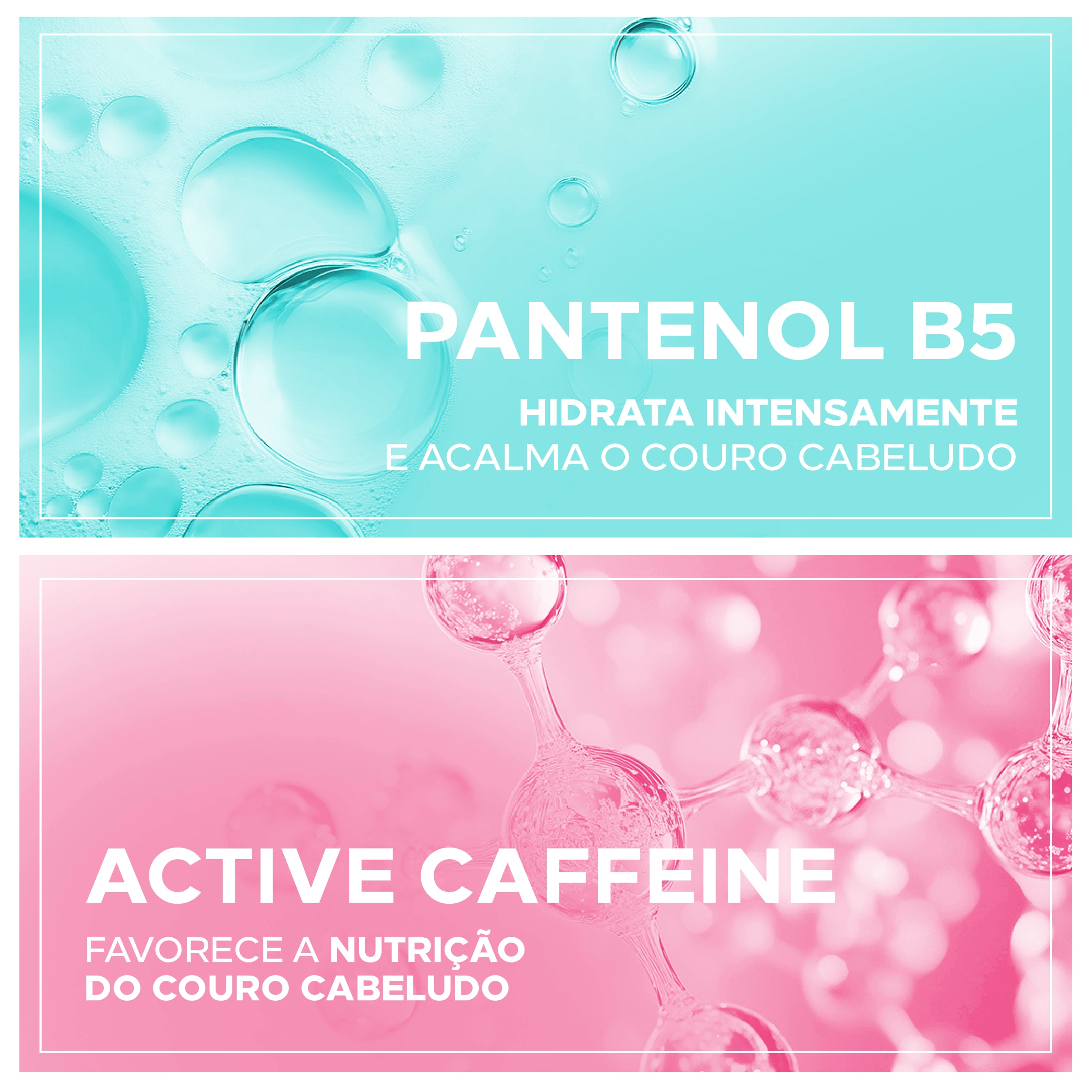 Caffeine: Com ação estimulante e antioxidante, fortalece os fios, combate a queda e estimula o crescimento, além de ativar a microcirculação do cabelo, favorecendo a oxigenação e absorção de nutrientes.