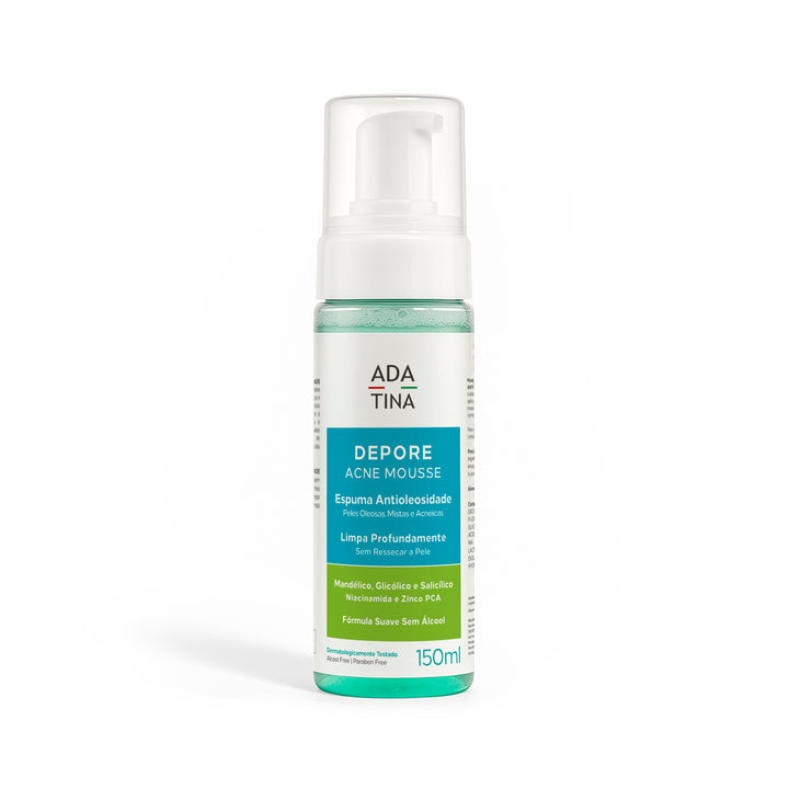 Depore Acne Mousse é uma espuma de limpeza facial antioleosidade indicada para peles mistas, oleosas e com acne. Sua fórmula combina Ácido Mandélico, Ácido Glicólico e Ácido Salicílico, que promovem renovação suave da pele, desobstruem os poros e ajudam a reduzir cravos e imperfeições. Enriquecida com Niacinamida, Peptídeos Antioleosidade e Zinco PCA, controla o brilho, melhora a textura e mantém a hidratação natural. Livre de sabão, álcool e parabenos, limpa profundamente sem ressecar, sendo ideal para uso diário.