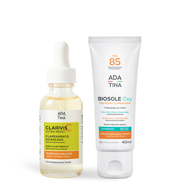 Kit Clareador Facial Dermatológico ADA TINA – Clarivis C Ultra Resist + Biosole Oxy FPS 85: combinação avançada para o cuidado da pele com melasma, manchas escuras, acne e tom irregular. O sérum Clarivis C, com Vitamina C estabilizada, Niacinamida e Alfa-Arbutin, auxilia no clareamento, uniformiza e ilumina a pele. O Biosole Oxy FPS 85 é um protetor solar clareador facial de toque seco, com proteção UVA/UVB muito alta, ajudando a prevenir manchas e fotoenvelhecimento, indicado para todos os tipos de pele.