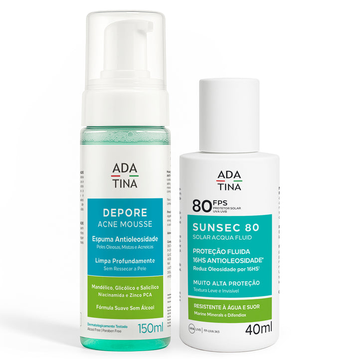 O Kit ADA TINA para pele oleosa e acneica une dois dermocosméticos de alta performance: o Sunsec Acqua Fluid FPS 80, protetor solar com textura invisível, toque seco e 12HS de proteção, e o Depore Acne Mousse, espuma de limpeza facial com ácidos renovadores, Niacinamida e Zinco PCA. Formulado para peles mistas, oleosas e com tendência à acne, este kit ajuda a proteger contra os efeitos da radiação solar, controlar o excesso de oleosidade e melhorar a textura da pele com suavidade e eficácia.