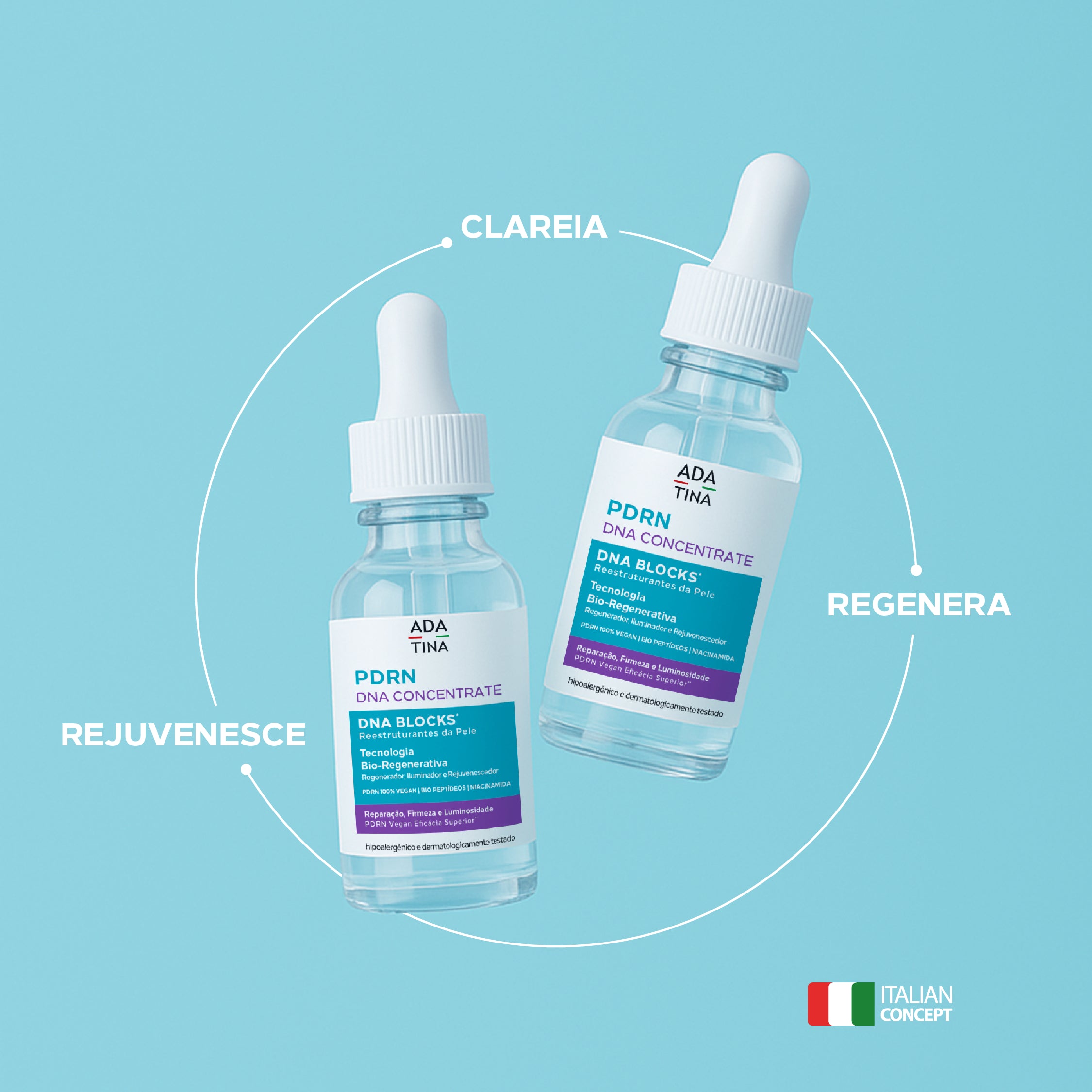 Seguindo o rigoroso Italian Concept da ADA TINA Italy, unimos eficácia extrema, pureza absoluta e segurança total para oferecer a próxima geração da bio-regeneração cutânea. O PDRN DNA CONCENTRATE (Vegano) supera o PDRN de Salmão em todos os parâmetros essenciais para firmeza, clareamento, reparação e regeneração celular.