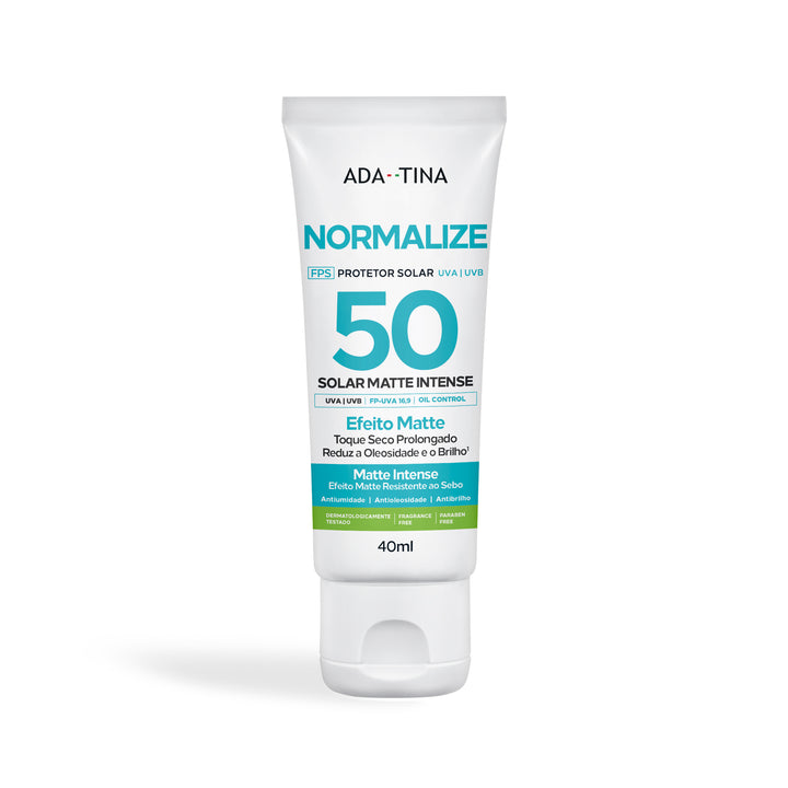 Normalize Solar Matte Intense FPS 50 é o protetor solar número 1 em antioleosidade, desenvolvido especialmente para peles oleosas, com acne, brilho excessivo e poros dilatados. Formulado com a exclusiva Tecnologia Organo Mineral ADA TINA, ele garante proteção avançada, efeito matte imediato e toque seco por até 12 horas, ideal para todos os fototipos e climas do Brasil.