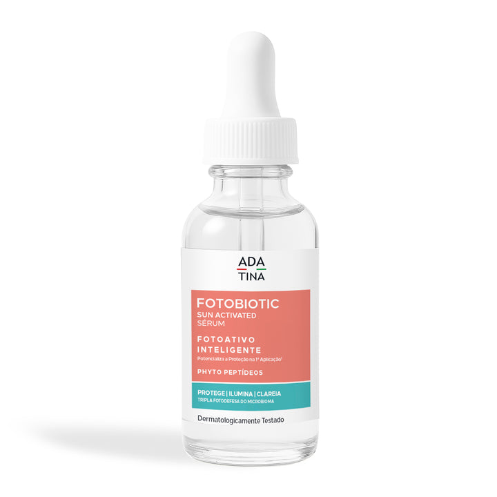 Fotobiotic Sun Activated Sérum é um clareador antioxidante fotoativado que combate manchas e hiperpigmentações enquanto protege contra danos solares e luz artificial. Sua fórmula com Phyto Peptídeos Fotoativos, Niacinamida e Ácido Hialurônico proporciona pele mais uniforme, luminosa e hidratada. De textura leve e toque seco, é ideal para uso diário, oferecendo ação antienvelhecimento e proteção contra UVA, UVB e luz azul. Desenvolvido por Ada Tina, combina inovação e eficácia dermatológica para clarear, proteger e revitalizar a pele com resultados visíveis desde as primeiras aplicações.